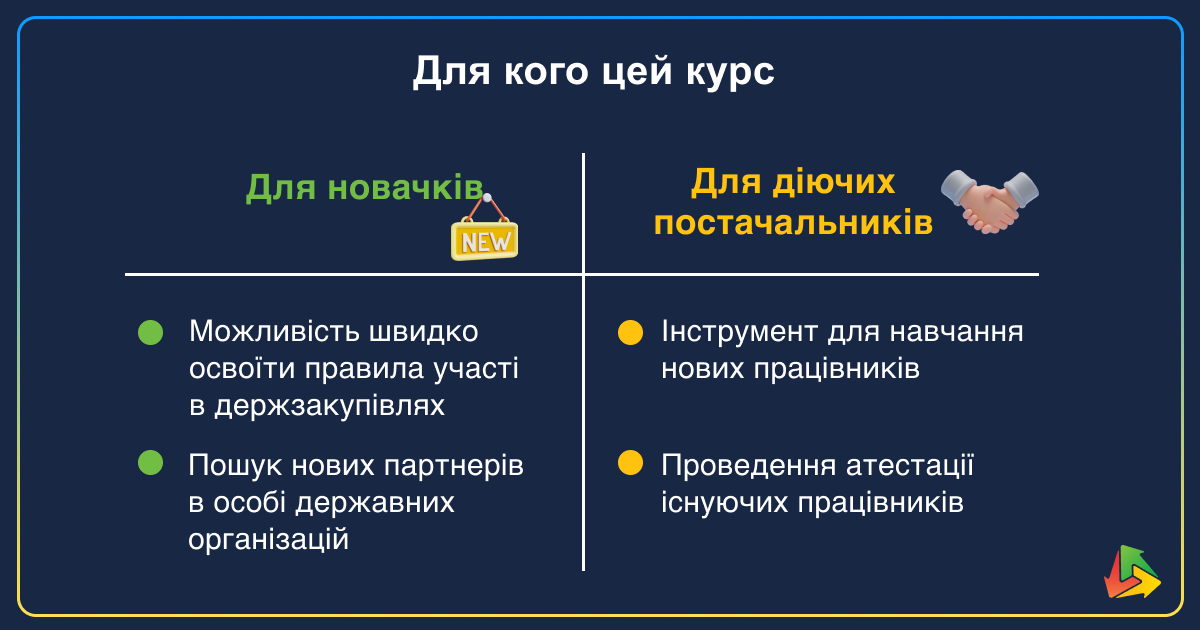 Курс розрахований як на початківців, так і на досвідчених постачальників. Новачки отримають систематизовану інформацію про те, як працює Прозорро та як успішно продавати державі. Для досвідчених учасників - це ще й стане інструмент атестації працівників компанії, а також можливість дізнаватися про останні новини у публічних закупівлях.